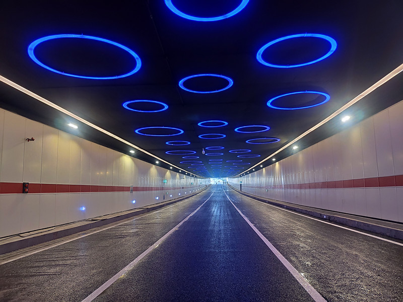 在隧道裝修方面,入口設(shè)置形如天鵝展翅遮光棚,改善進(jìn)出隧道行車(chē)視線;隧道內(nèi)白墻黑頂,紅色腰線伸向遠(yuǎn)處,內(nèi)頂鑲嵌圓形LED燈飾,如湖底映射的一個(gè)個(gè)藍(lán)色漣漪。